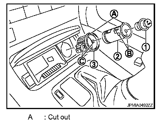 4. Pull out cigarette lighter socket (2) by pushing the cigarette lighter ring pawl (C) from the cigarette lighter socket hole