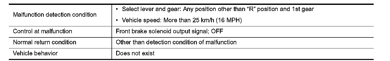 Controls the engine brake so as not to make effective by turning the front brake solenoid output to OFF when each solenoid becomes the electricity pattern of 1st gear engine brake during driving at the vehicle speed 25 km/h or more in any positions other than "R" position and 1st gear.