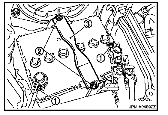 6. Remove battery fix frame mounting nuts (2) and battery fix frame (3).