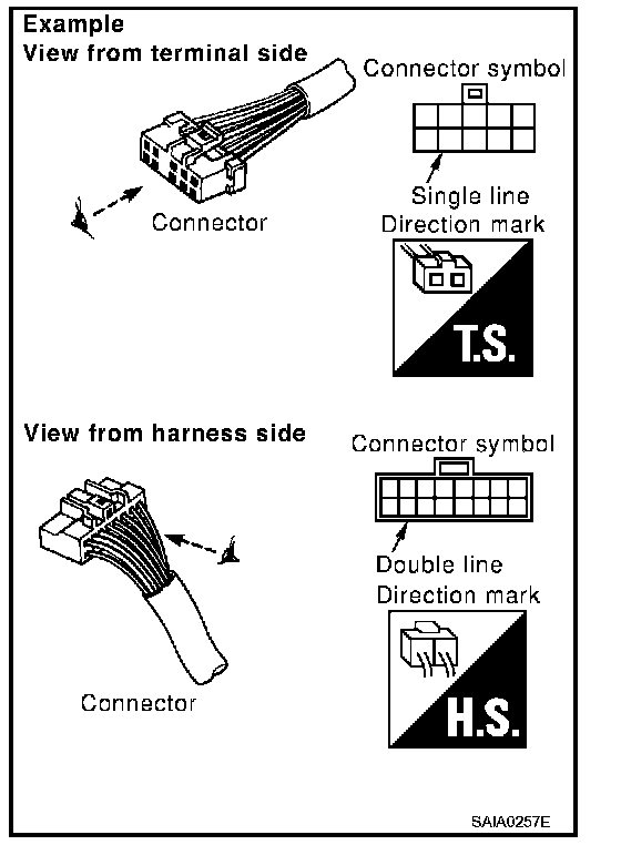 - Connector symbols shown from the harness side are enclosed by a double line and followed by the direction mark.