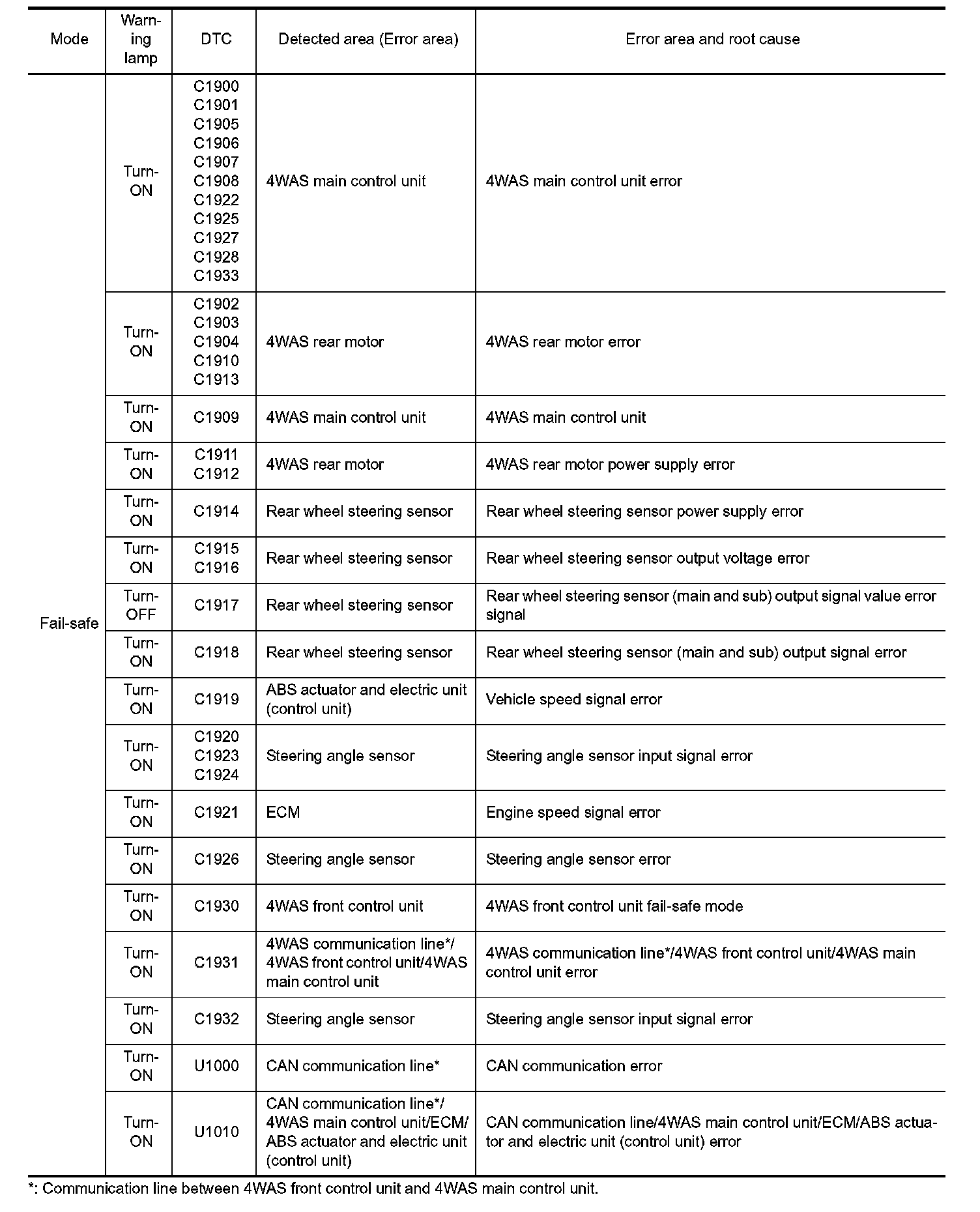 - 4WAS system enters in the fail-safe mode (4WAS system stopped) and 4WAS warning lamp turns ON if an error is detected in 4WAS system (4WAS main control unit) component part.