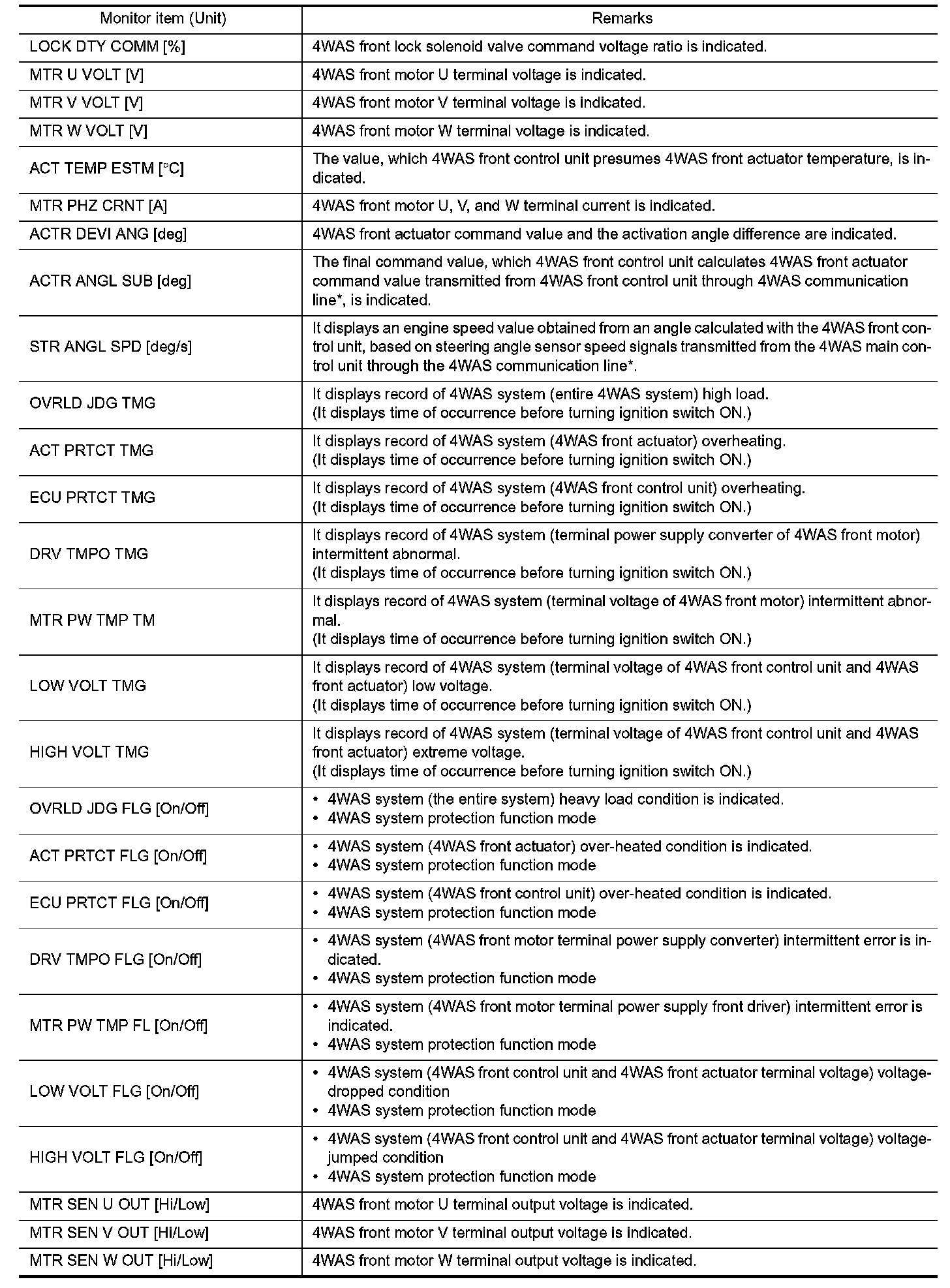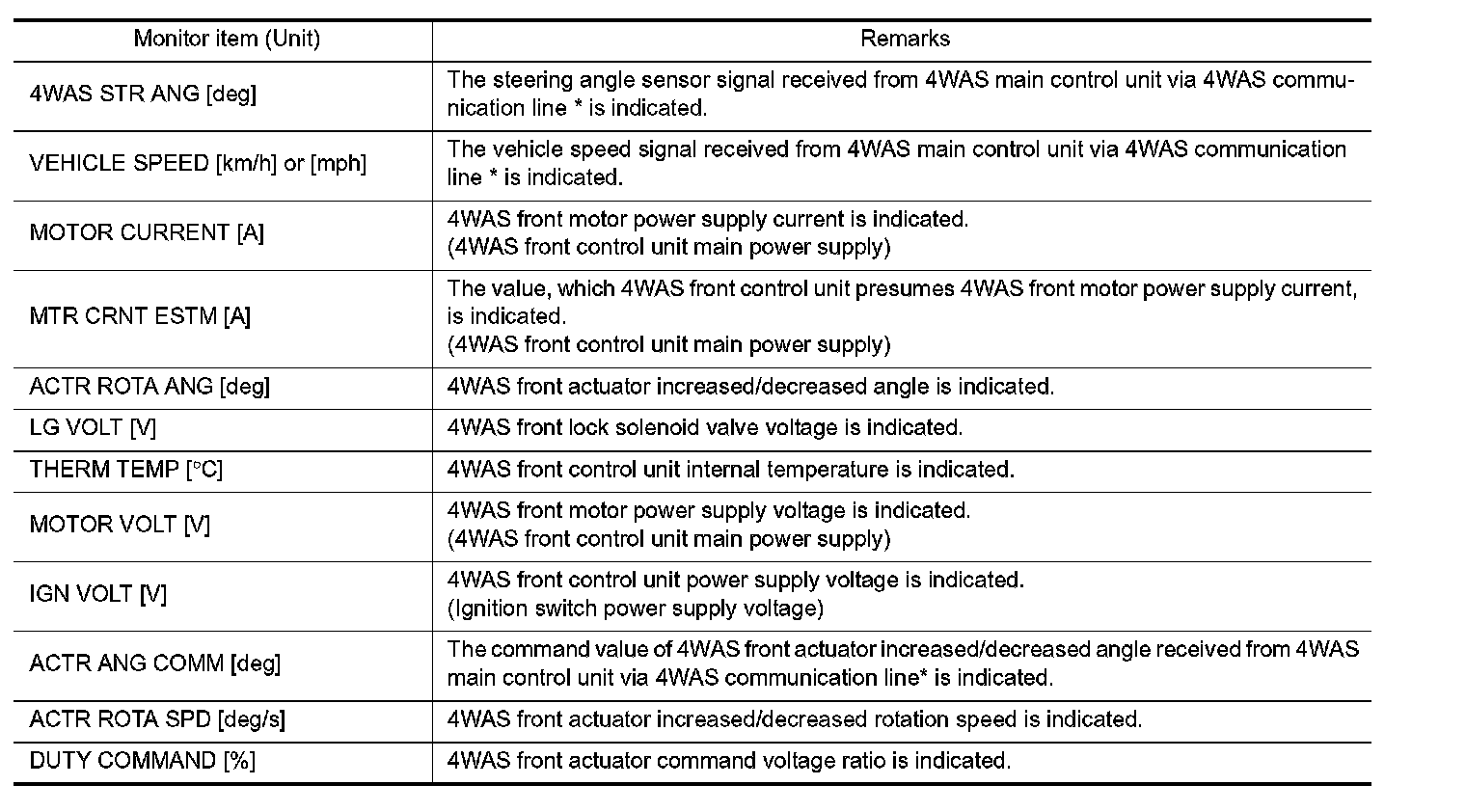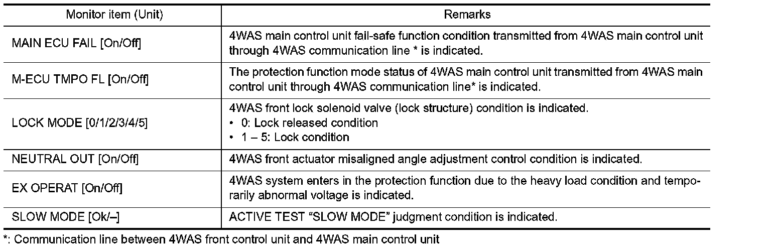 - The communication condition from 4WAS front control unit to 4WAS main control unit and malfunction counter are displayed.
