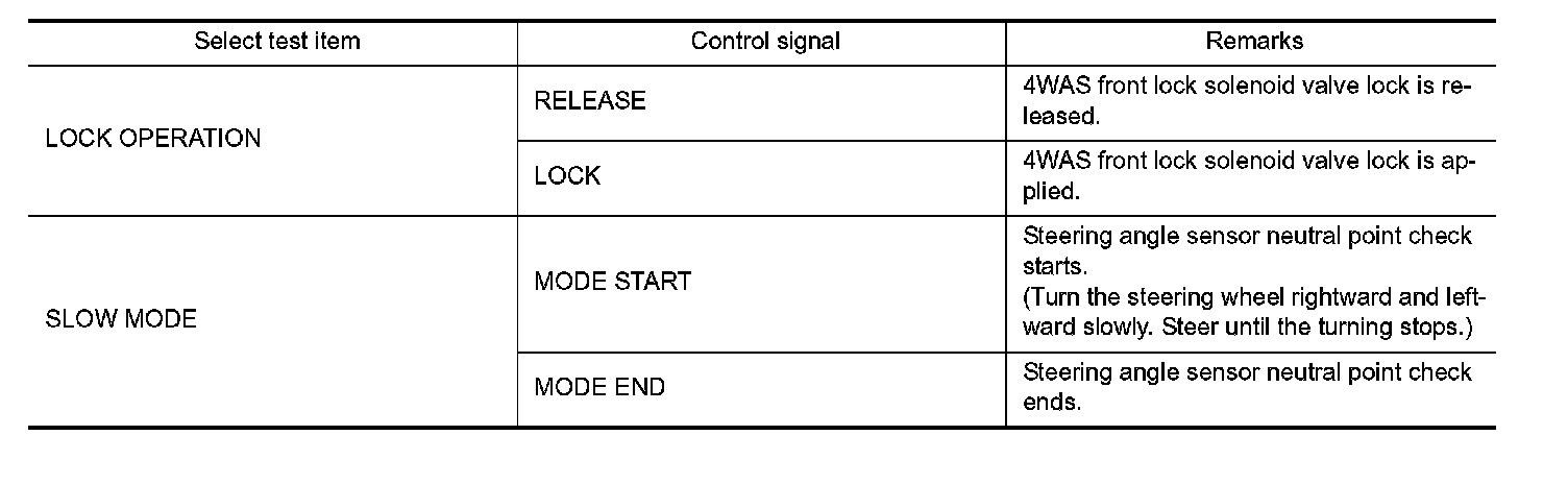 - 4WAS front lock solenoid valve (lock structure) is activated forcibly (ON/OFF) using each control signal of "LOCK OPERATION". Perform this mode when performing 4WAS front actuator adjustment.