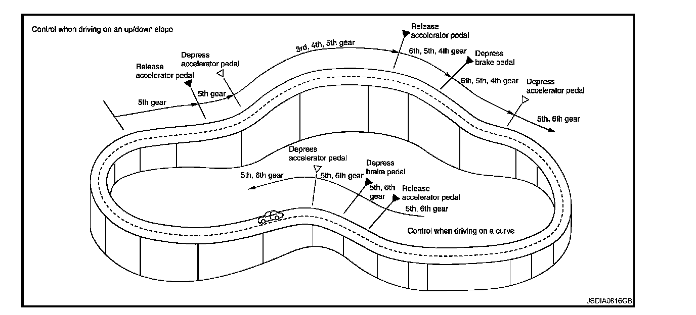 TCM receives the side G sensor signal from the ABS actuator and electric unit (control unit). It locks the gear to the 4th, 5th or 6th position in moderate cornering or to the 3rd position in sharp cornering based on this signal. This prevents any upshift and kickdown during cornering, maintaining smooth vehicle travel.