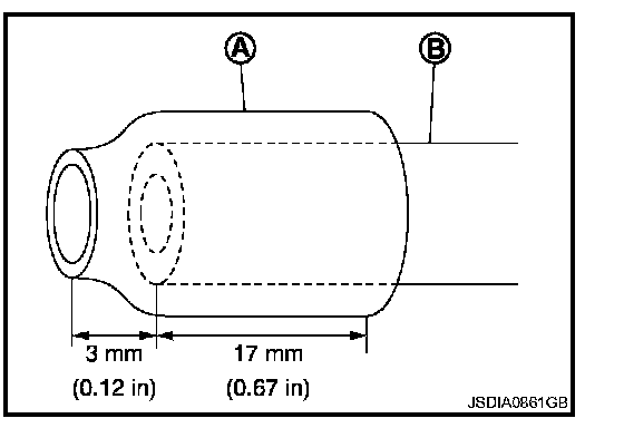 1. 1st Step a. Cut the vacuum hose (B2318 N3301) (A) by 20 mm (0.79 in) to fit in at the top of the ATF exchanger pipe (B) as shown in the figure.