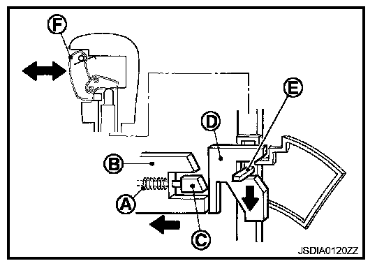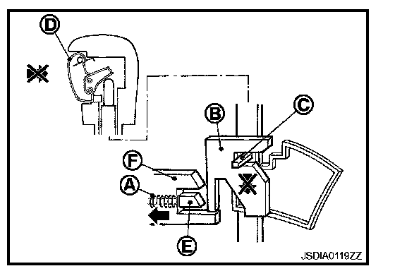 The lock plate (B) lowers according to the downward movement of the position pin (C) when the selector button (D) is pressed, and presses only slider B (E) into the shift lock unit. Slider A (F) located below the lock plate prevents the downward movement of the lock plate with the spring force. The selector lever cannot be shifted from the "P" position for this reason.