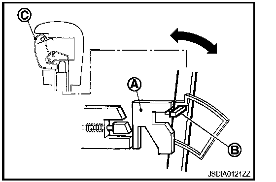The shift lock solenoid (A) inside the shift lock unit is energized and the relative positions of sliders A (B) and B (C) are maintained when the brake pedal is depressed while the ignition switch is ON.
