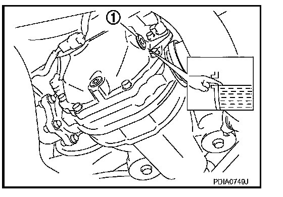 - Remove filler plug (1) and check oil level from filler plug mounting hole as shown in the figure.