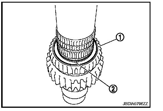 7. Install spacer (1) and steel ball (2) to main shaft.