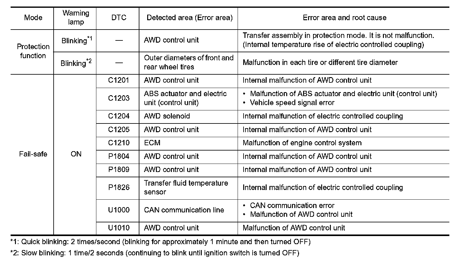 - When AWD warning lamp is ON, vehicle changes to rear-wheel drive or shifts to 4-wheel drive (front-wheels still have some driving torque).