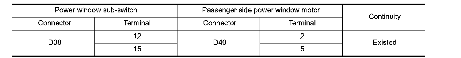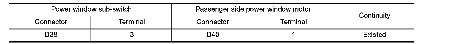 3. Check continuity between power window sub-switch harness connector and passenger side power window motor harness connector.