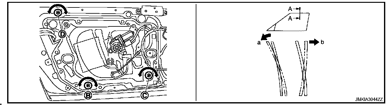 - When adjusting with adjusting bolt (D), turn the adjusting bolt clockwise to move the door glass upper end inward, then anticlockwise to move the door glass upper end outward.