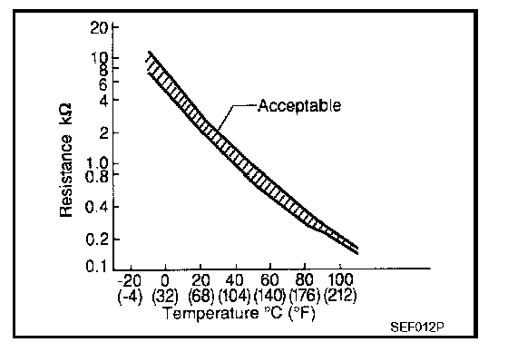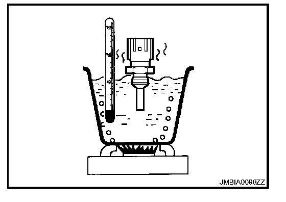4. Check resistance between engine coolant temperature sensor terminals by heating with hot water as shown in the figure.