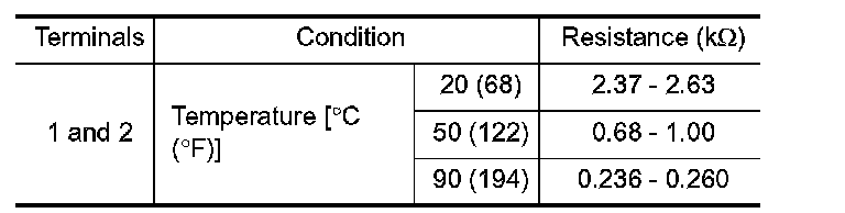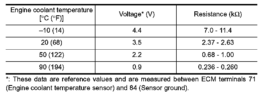 The engine coolant temperature sensor is used to detect the engine coolant temperature. The sensor modifies a voltage signal from the ECM. The modified signal returns to the ECM as the engine coolant temperature input. The sensor uses a thermistor which is sensitive to the change in temperature. The electrical resistance of the thermistor decreases as temperature increases.