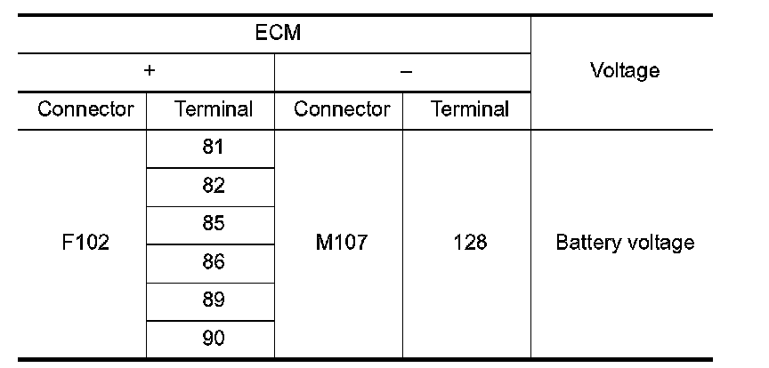 2. Check the voltage between ECM harness connector terminals as per the following.