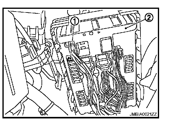 2. Remove fuel pump fuse (1) in IPDM E/R (2) to release fuel pressure.