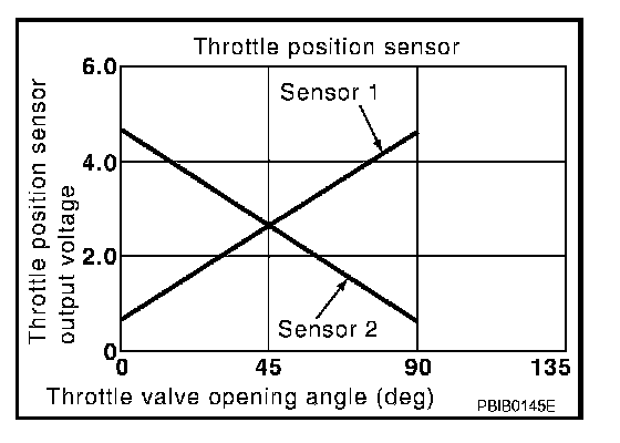 The throttle position sensor has two sensors. These sensors are a kind of potentiometer which transform the throttle valve position into output voltage, and emit the voltage signals to the ECM. The ECM judges the current opening angle of the throttle valve from these signals and the throttle valve opening angle properly in response to driving condition via the throttle control motor.