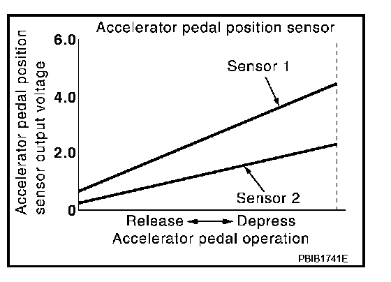 Accelerator pedal position sensor has two sensors. These sensors are a kind of potentiometer which transform the accelerator pedal position into output voltage, and emit the voltage signal to the ECM.
