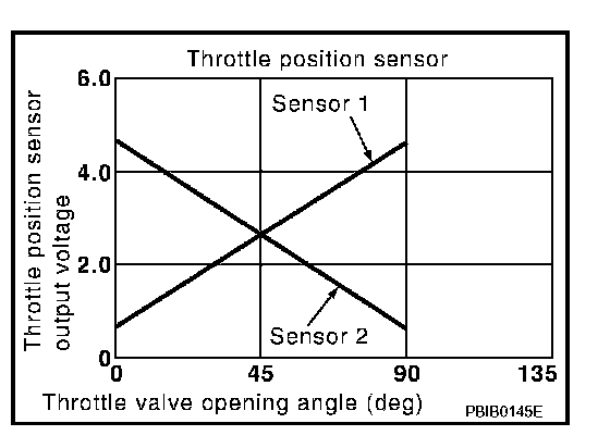 The throttle position sensor has two sensors. These sensors are a kind of potentiometer which transform the throttle valve position into output voltage, and emit the voltage signals to the ECM. The ECM judges the current opening angle of the throttle valve from these signals and the throttle valve opening angle properly in response to driving condition via the throttle control motor.