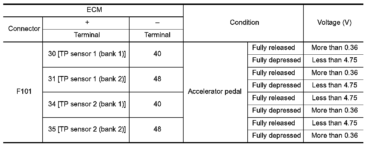 6. Check the voltage between ECM harness connector terminals as per the following.