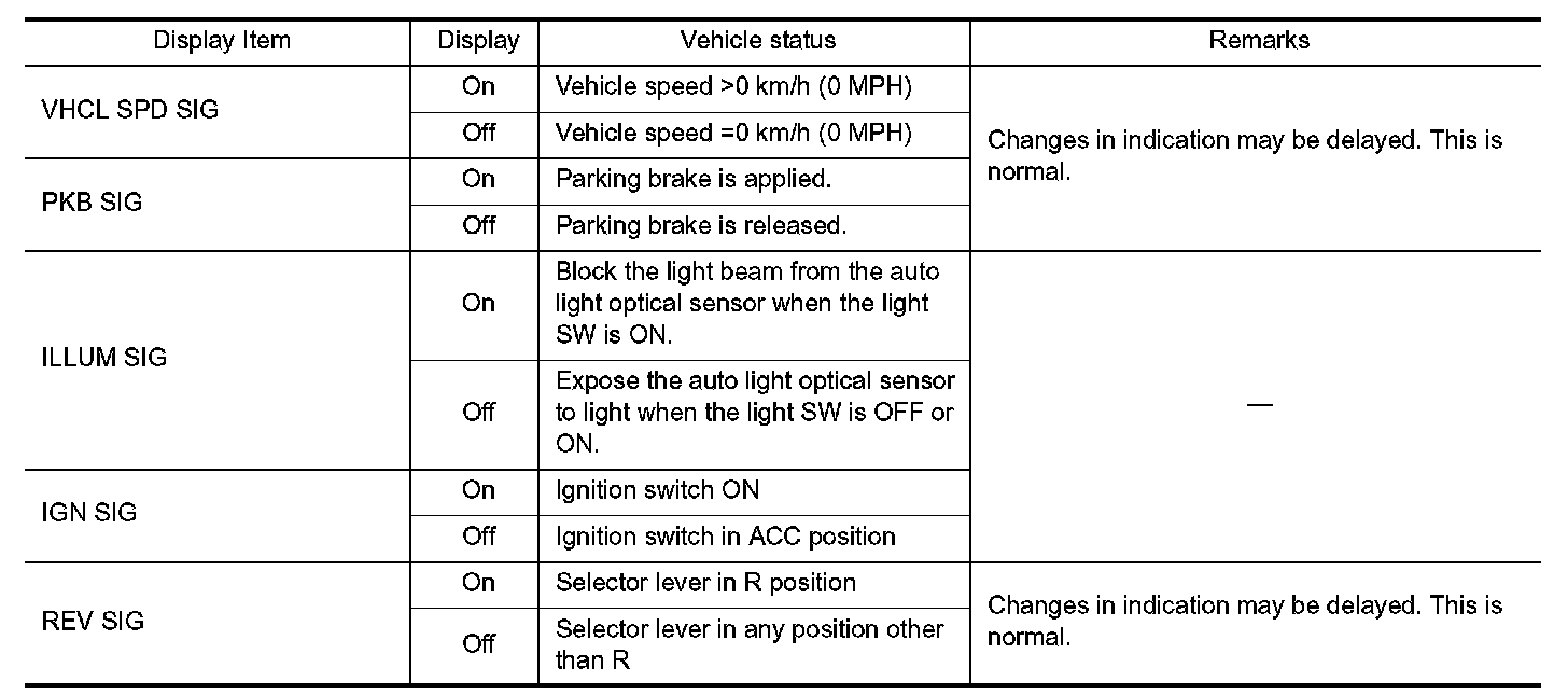 - Displays the status of the following vehicle signals inputted into the AV control unit.
