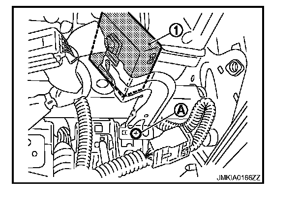 2. Remove the remote keyless entry receiver mounting bolt (A), and then remove remote keyless entry receiver (1).