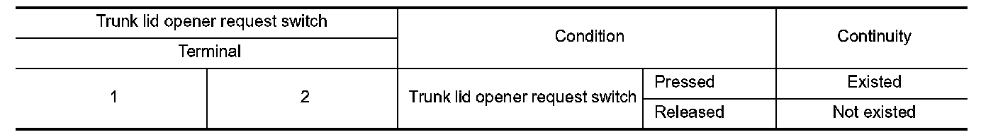 3. Check continuity between trunk lid opener request switch terminals.