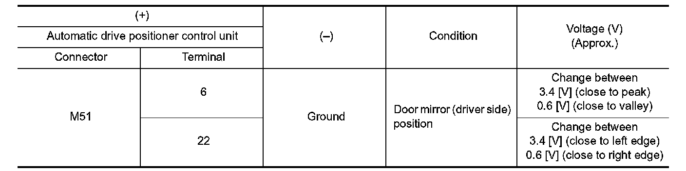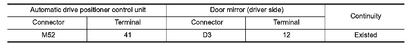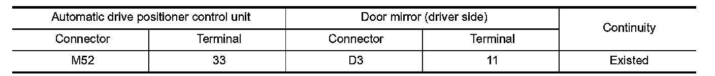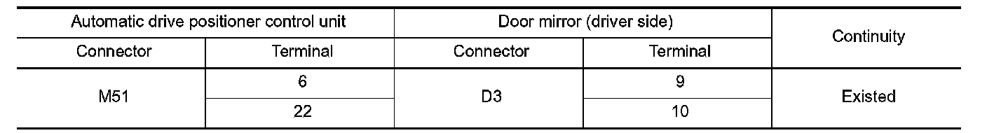 3. Check continuity between automatic drive positioner control unit harness connector and door mirror
