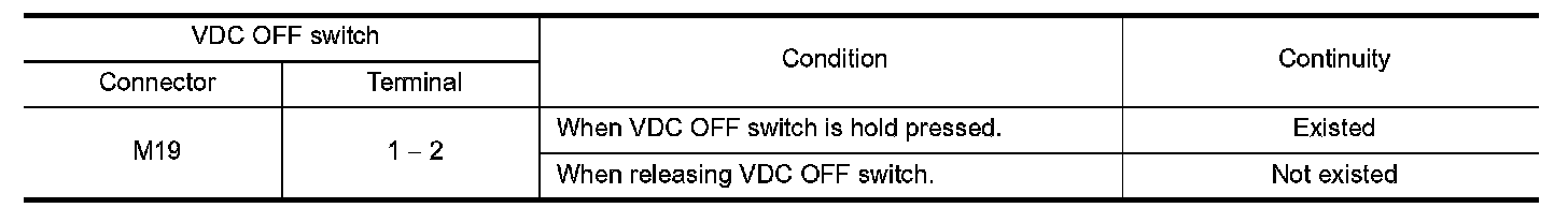 3. Check continuity between VDC OFF switch connector terminals.