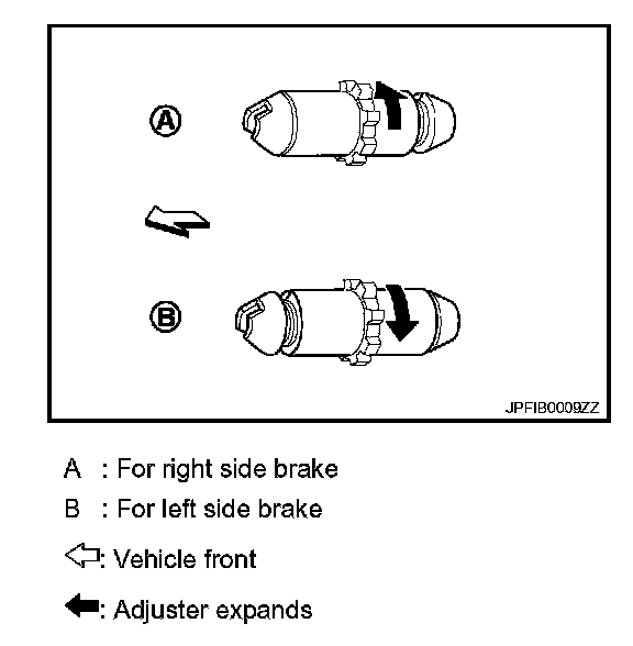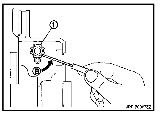 b. Using suitable tool, rotate adjuster (1) in the direction (B) to retract and loosen brake shoe.
