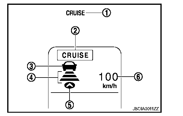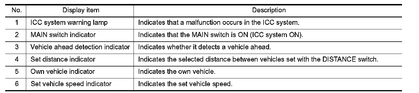 The MAIN switch indicator (cruise indicator), set distance indicator, own vehicle indicator, and set vehicle speed indicator come on and ICC system is set to a standby state.