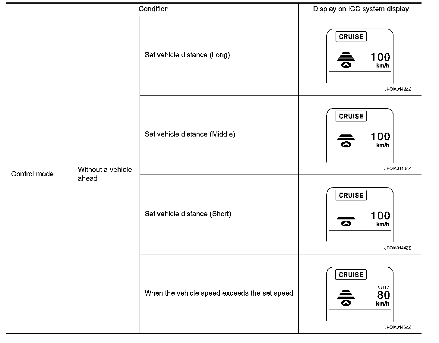- When there are no vehicles traveling ahead, the vehicle-to-vehicle distance control mode maintains the speed set by the driver. The set speed range is between approximately 40 and 144 km/h (25 and 90 MPH).
