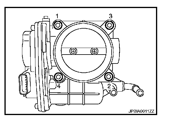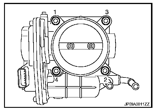 - Viewed from the air duct side, the order of tightening mounting bolts of electric throttle control actuator (bank 2) is the same as that of the electric throttle control actuator (bank 1).