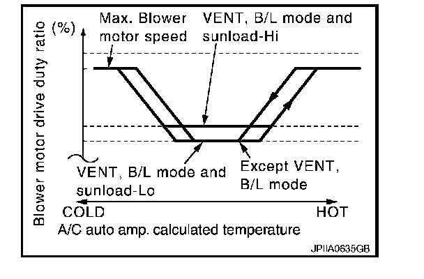 The low speed varies depending on the sunload. During conditions of low or no sunload, the fan speed is at duty ratio 25%. During high sunload conditions, the unified meter and A/C AMP. raise the fan speed (duty ratio