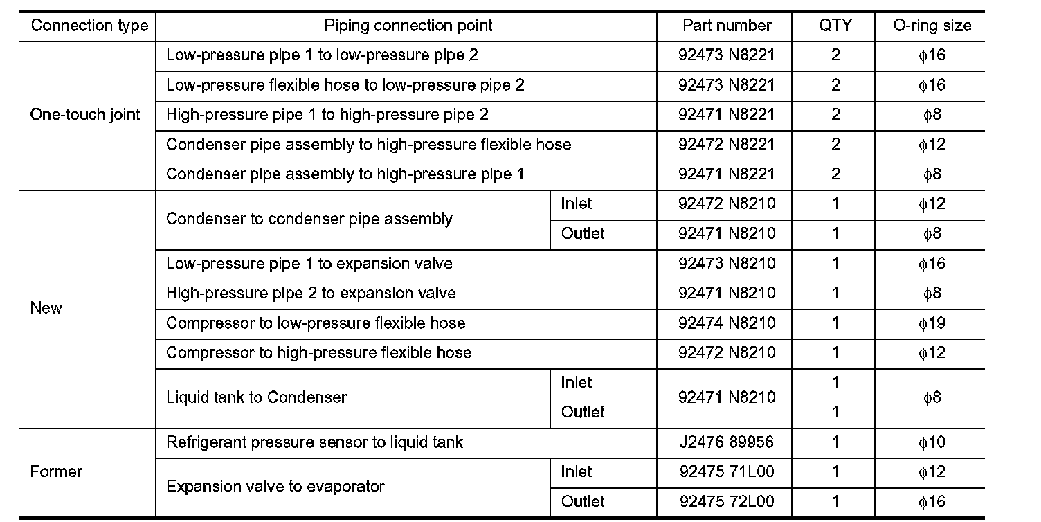 The new and former refrigerant connections use different O-ring configurations. Never confuse Orings since they are not interchangeable. Refrigerant may leak at the connection if a wrong O-ring is installed.