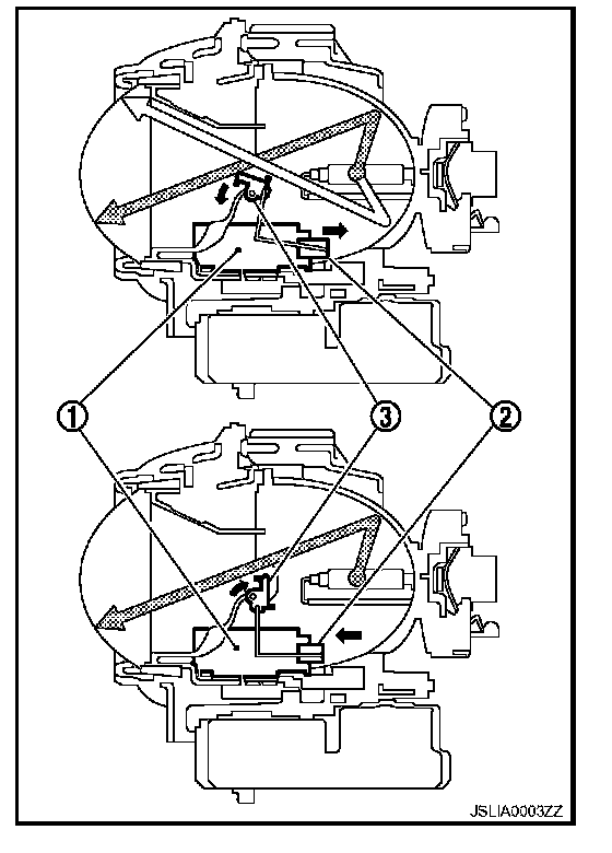 - When the headlamp high relay is turned ON, magnetic force is applied to the high beam solenoid (1) by a current. The mobile valve shade (3) is switched to the high beam position through the actuator rod (2).
