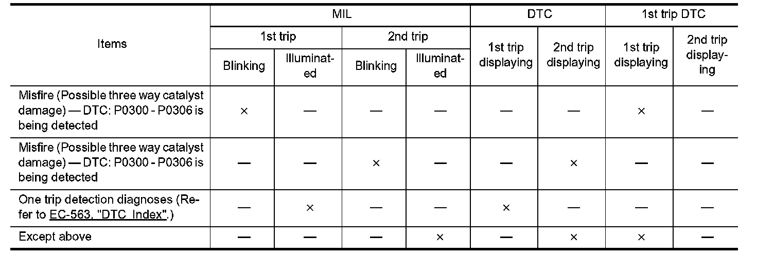 The "trip" in the "Two Trip Detection Logic" means a driving mode in which self-diagnosis is performed during vehicle operation. Specific on board diagnostic items will cause the ECM to illuminate or blink the MIL, and store DTC and Freeze Frame data, even in the 1st trip, as shown below.