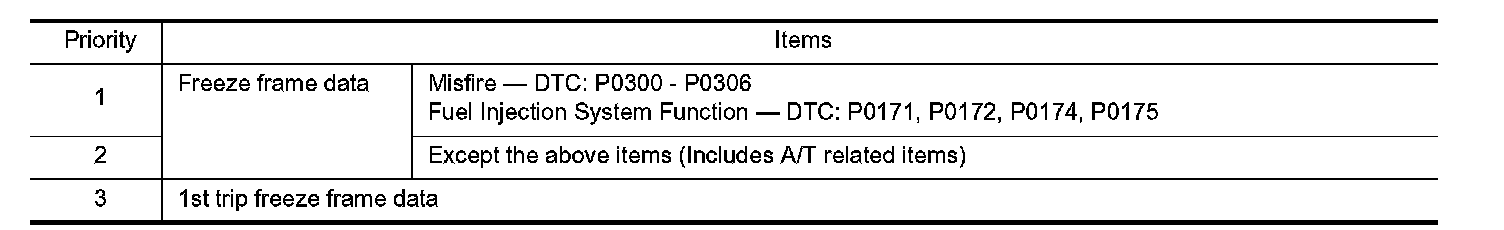 For example, the EGR malfunction (Priority: 2) was detected and the freeze frame data was saved in the 2nd trip. After that when the misfire (Priority: 1) is detected in another trip, the freeze frame data will be updated from the EGR malfunction to the misfire. The 1st trip freeze frame data is updated each time a different malfunction is detected. There is no priority for 1st trip freeze frame data. However, once freeze frame data is stored in the ECM memory, 1st trip freeze data is no longer stored (because only one freeze frame data or 1st trip freeze frame data can be stored in the ECM). If freeze frame data is stored in the ECM memory and freeze frame data with the same priority occurs later, the first (original) freeze frame data remains unchanged in the ECM memory.