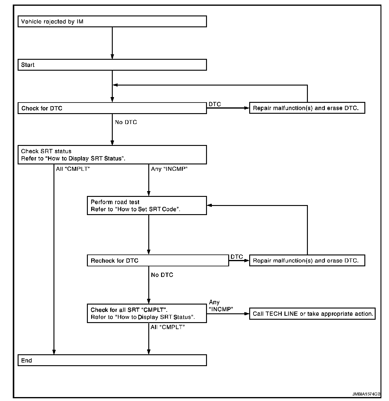 If, during the state emissions inspection, the SRT indicates "CMPLT" for all test items, the inspector will continue with the emissions test. However, if the SRT indicates "INCMP" for one or more of the SRT items the vehicle is returned to the customer untested.