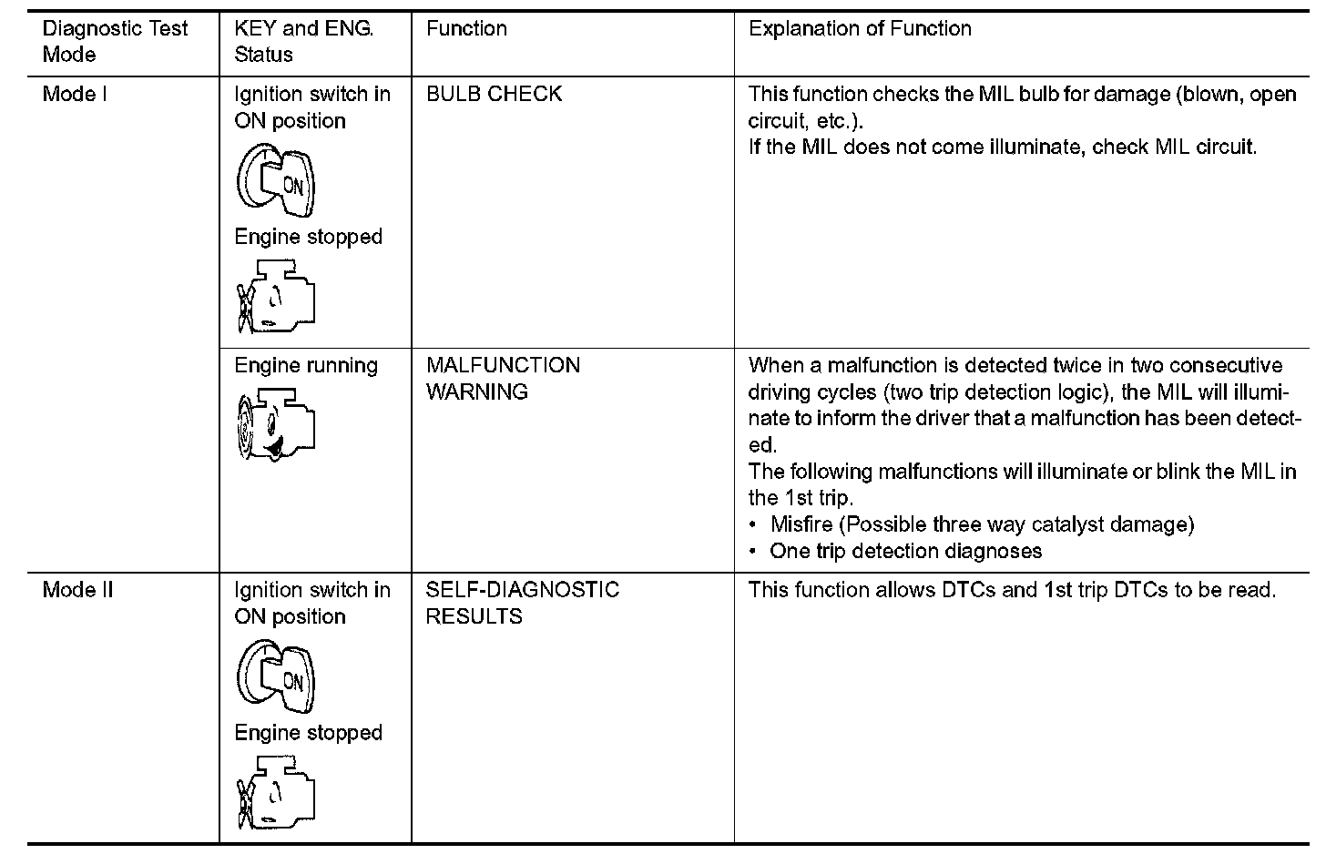 1. The MIL will illuminate when the ignition switch is turned ON without the engine running. This is a bulb check.
