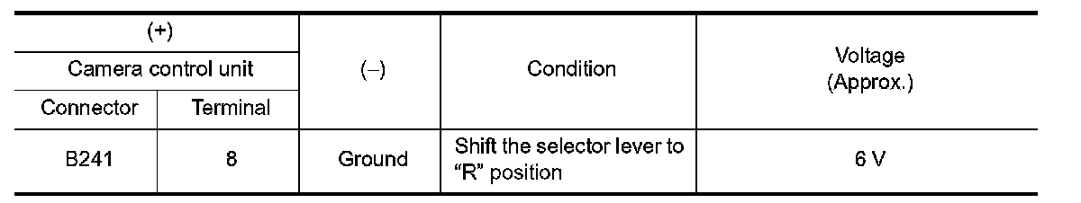 3. Check voltage between camera control unit harness connector terminal 8 and ground.
