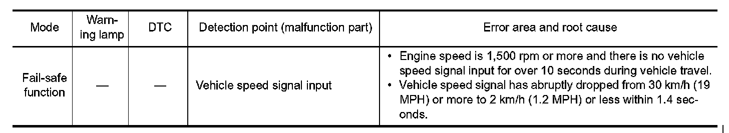 - The fail-safe function is canceled when a vehicle speed signal of 2 km/h (1.2 MPH) or more is inputted or the key switch is turned