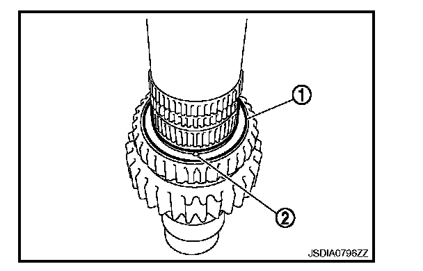 7. Install spacer (1) and steel ball (2) to main shaft.