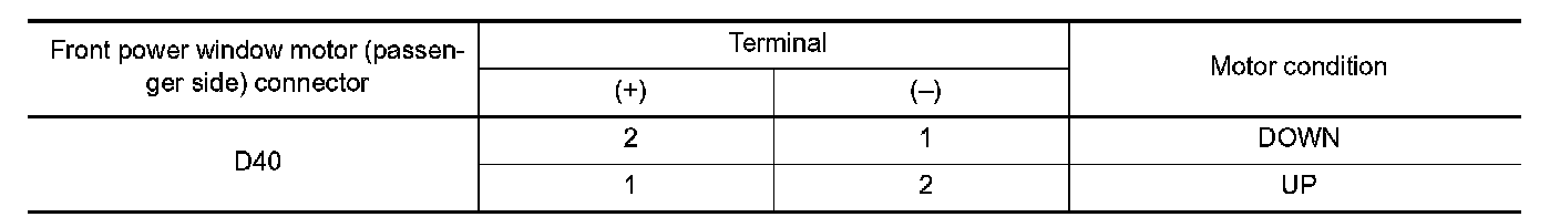 3. Check motor operation by connecting the battery voltage directly to front power window motor (passenger side) terminals.