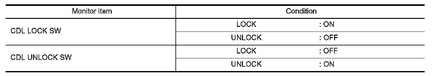 Check ("CDL LOCK SW ", "CDL UNLOCK SW") in "DATA MONITOR" mode for "POWER DOOR LOCK SYSTEM" with CONSULT-III. Refer to Door Lock.