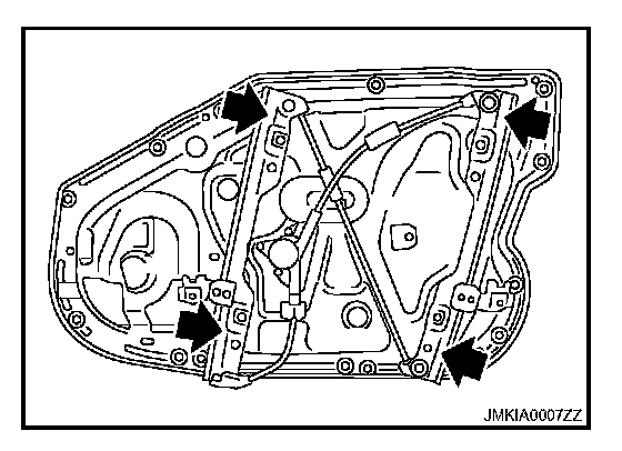 - Lower the glass slightly [approximately 10 to 20 mm (0.394 to 0.787 in)] and check that the clearance to the sash is parallel. If the clearance between the glass and sash is not parallel, loosen the regulator mounting bolts, guide rail mounting bolts, and glass and guide rail mounting bolts to correct the glass position.