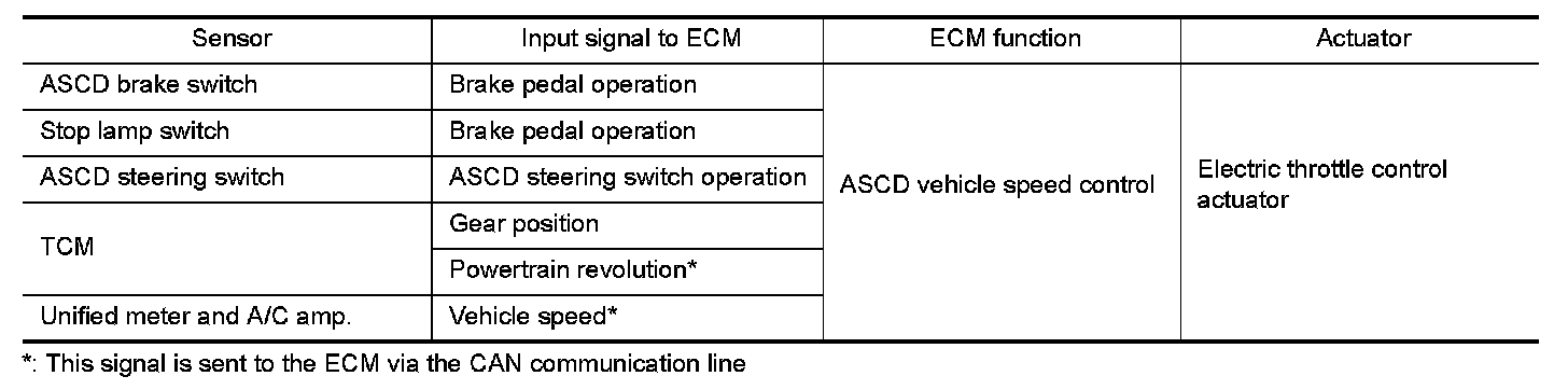 Operation status of ASCD is indicated by CRUISE indicated and SET indicator in combination meter. If any malfunction occurs in the ASCD system, CRUISE lamp blinks and ASCD control is deactivated.