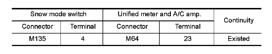 3. Check the continuity between snow mode switch harness connector and "unified meter and A/C amp." harness connector.