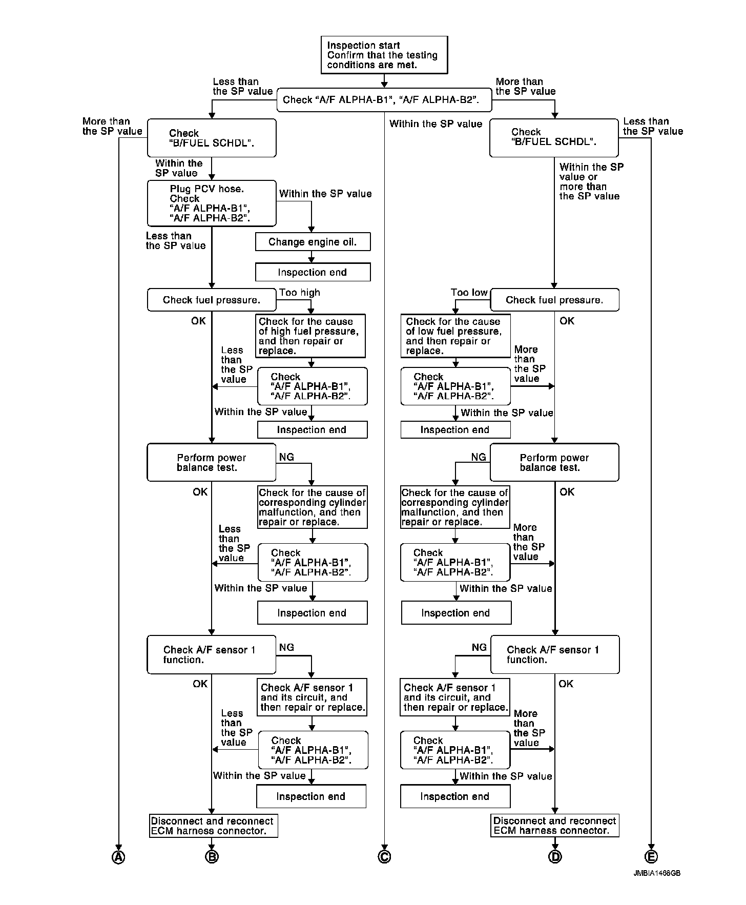 Check "A/F ALPHA-B1", "A/F ALPHA-B2" for approximately 1 minute because they may fluctuate. It is NG if the indication is out of the SP value even a little.
