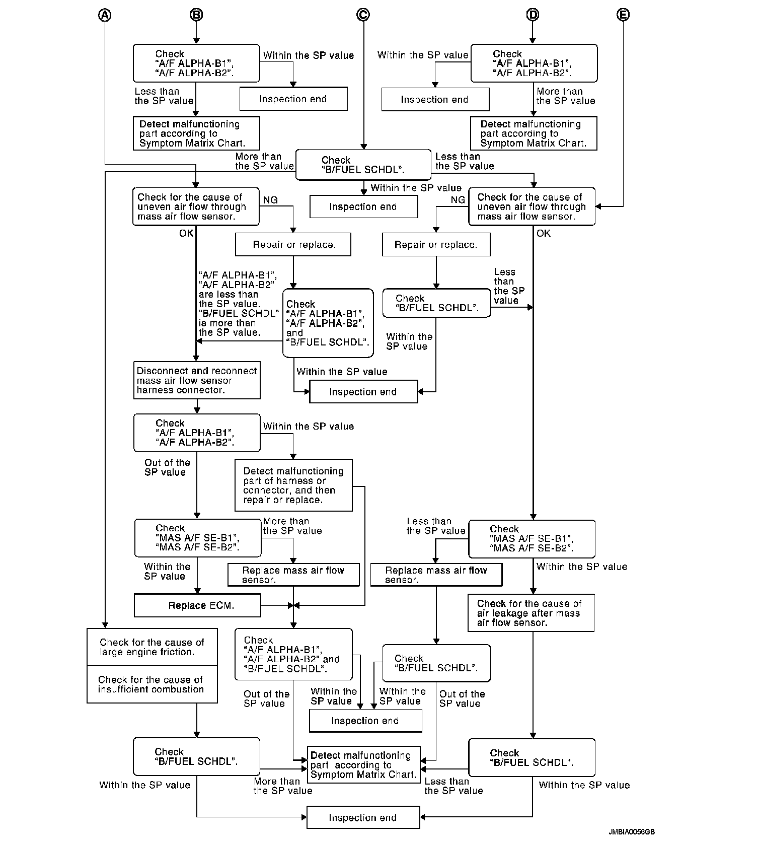 Select "MAS A/F SE-B1", "MAS A/F SE-B2" in "SPEC" of "DATA MONITOR" mode, and check that the indication is within the SP value.